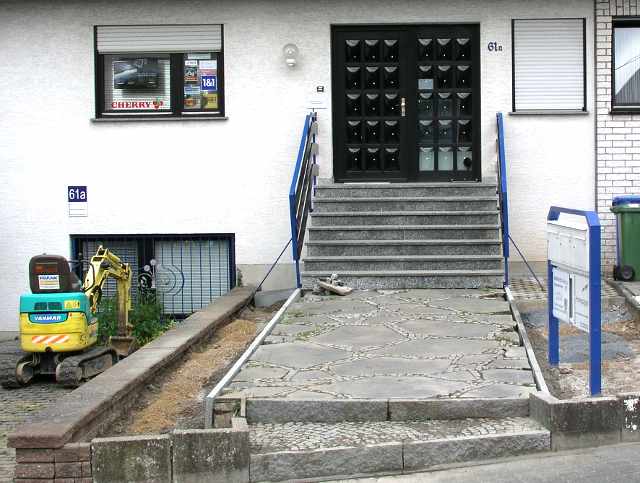 Der Auftrag: bei diesem Hauseingang die Grünanlagen komplett zu erneuern, das Pflaster zu sanieren und einen neuen Mülltonnenstellplatz anzulegen.